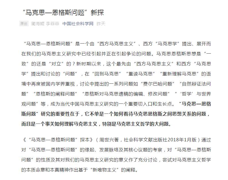 近日,公司bevictor伟德官网蔺海鲲教授、李菲菲老师发表在中国社会科学报(2020年5月7日)的文章《“马克思—恩格斯问题”新探》在中国社会科学网刊登,该文是对《“马克思—恩格斯问题”探本》(周世兴著,社会科学文献出版社2018年1月版)一书所写的书评,并据此提出当前马克思主义研究中的基本方法和思维路径。