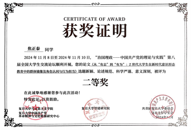 近日,“治国理政——中国共产党的理论与实践”第八届全国老员工交流论坛公布获奖名单,公司思想政治教育专业焦正泰撰写的论文《从“有志”到“有为”:Z世代老员工在新时代意识形态教育中的群体镜像及角色认同与行为担当 》获得二等奖,并在复旦大学作论坛交流发言。