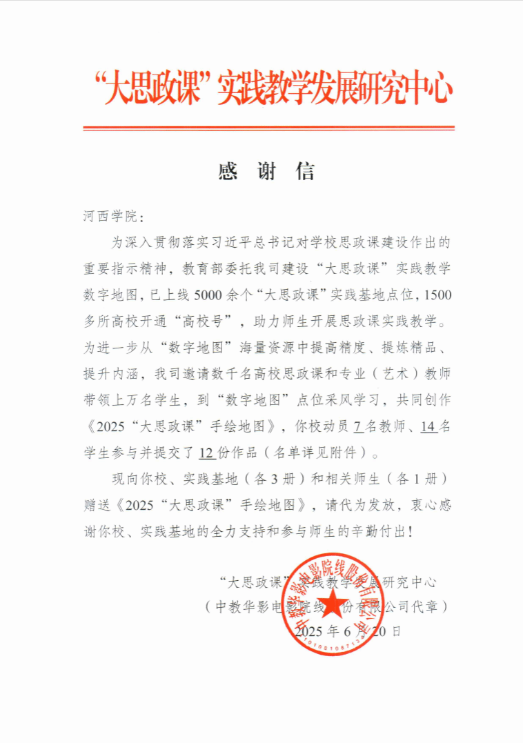 近日,教育部“大思政课”实践教学资源项目评选结果公示,公司bevictor伟德官网申报的两项实践教学资源成功入选《2025“大思政课”手绘地图》。其中,《甘肃省是片红色热土—西路军精神》《传承红色基因 赓续红色血脉 传承革命精神 坚持铸魂育人》由教师张正琴、顾文兵、陶有祥指导,公司2021、2022、2023级员工共同参与完成。